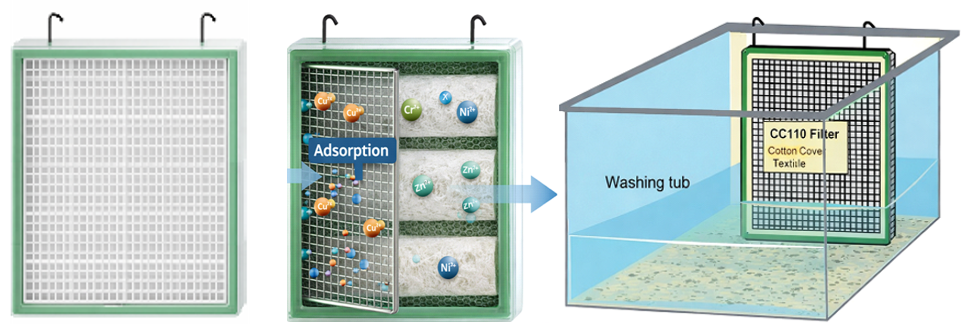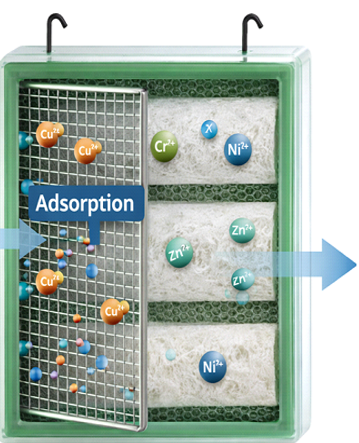 The CC110 operates without electricity or pumps. It is simply placed in electroplating rinse tanks, where natural adsorption removes heavy metals such as Cu, Ni, Cr, Fe, Zn, Co, and Cd.